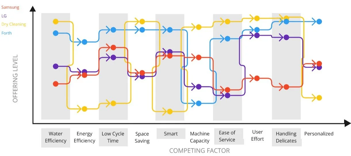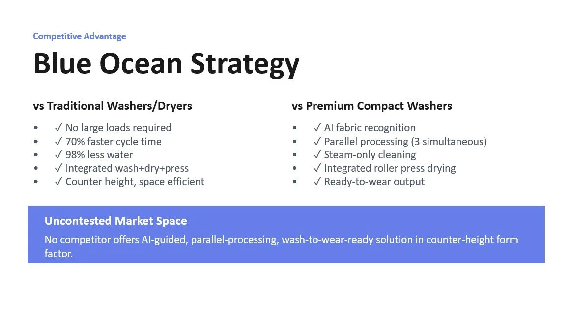 The Blue Ocean Strategy Canvas maps Smart Laundry Tower against traditional appliances (Samsung, LG) and premium services across 10 competing factors. While incumbents optimize for batch capacity and dry cleaners excel at garment care, Smart Laundry Tower occupies uncontested market space: 20-minute wash-to-wear cycles with 98% less water in a counter-height form factor. The strategic insight: stop competing on capacity, start winning on speed and convenience.